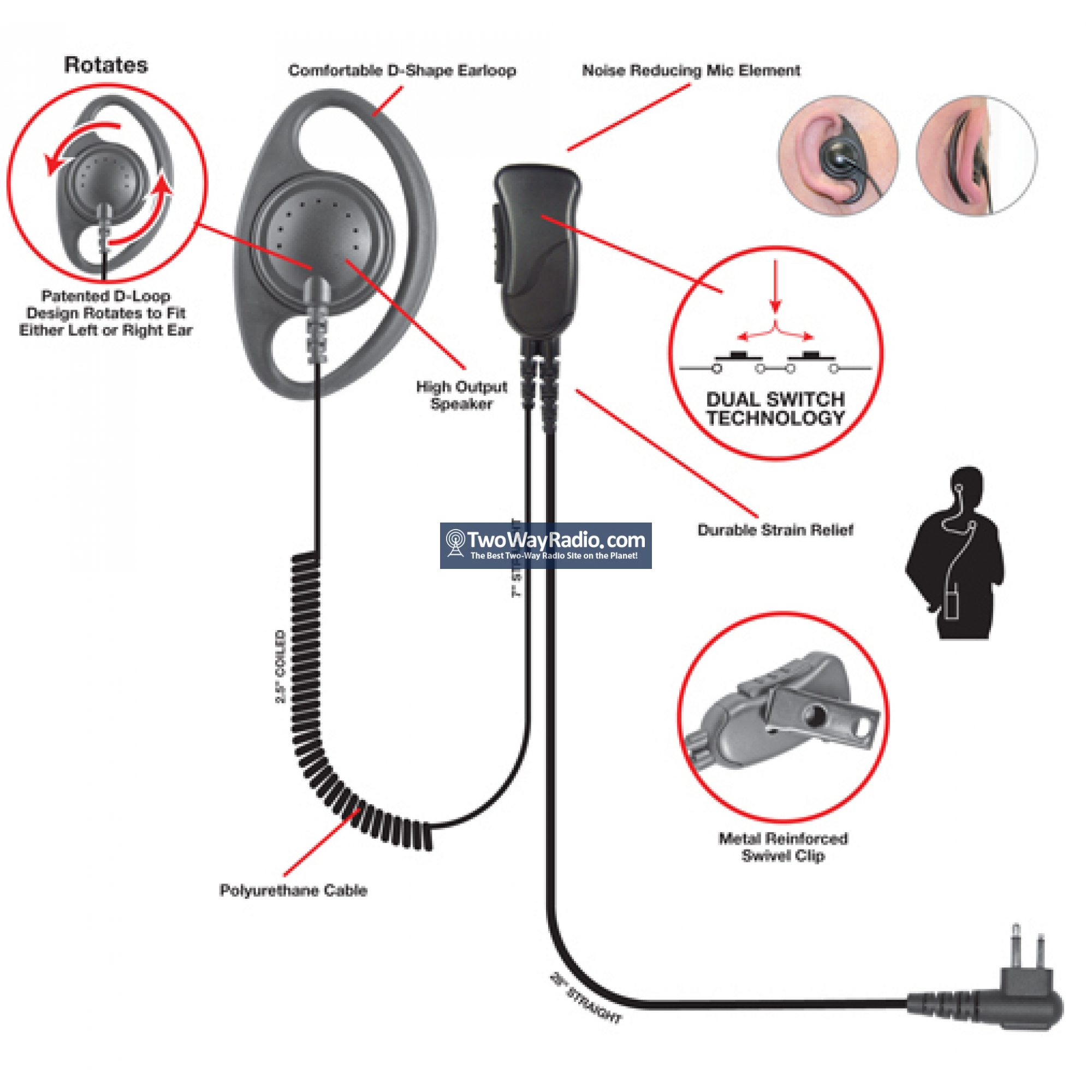 • Botón de PTT al lado del micrófono, con montaje para oído.